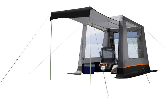 Verschließbare Hochentlüftung an der Vorderwand. Eingang als Sonnendach ausstellbar. Moskitogaze-Belüftung an der Rückwand (von außen verschließbar). Innen angebrachte Abdeckklappen für alle drei Fenster.