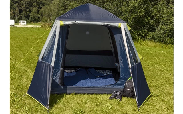 Dieses Faltzelt überzeugt durch seinen schnellen Aufbau aufgrund des praktischen Faltgestänges. Die Fenster (je 50 % Moskitogaze, 50 % Folie) lassen ausreichend Licht in das Zelt und schaffen ein angenehmes Raumklima. Das Zelt kann ohne Überdach aufgestellt werden. Die doppelt abgedeckten Reißverschlüsse sorgen für ein dichtes Zelt. In der Mitte befindet sich eine Lampenanbringung. Die Tür der Schlafkabine kann blickdicht verschlossen werden und verfügt zusätzlich über eine Moskitogazetür. Die Schlafkabinen ist nicht herausnehmbar. Die großen Moskito-Seitenwände am Innenzelt sorgen für eine sehr gute Luftzirkulation. Die komfortable Stehhöhe beträgt 185 cm.
