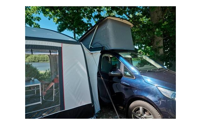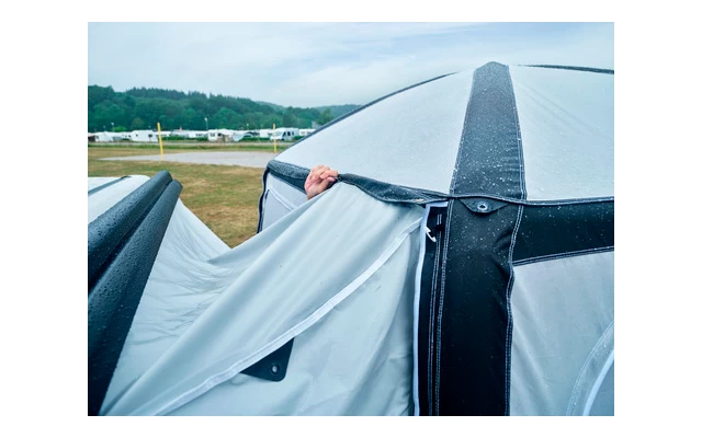 Die Verbindungsschleuse wird per Reißverschluss mit dem Vorzelt verbunden und lässt sich sehr schnell auch wieder lösen, um z.B. einen Tagesausflug mit dem Fahrzeug zu unternehmen. Die Fahrzeugspezifische Schleuse ermöglicht einen sehr guten Abschluss am Fahrzeug.