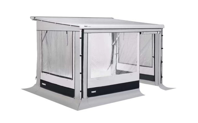 Perfekte Dachabdichtung dank Klemmprofilen für das Anbringen der Seitenwände und deren Verbindung mit dem Markisenstoff. Vorder- und Seitenwände sind mit schwarzen Doppelprofilen für optimalen Verschluss versehen.. Die Vorderwand besitzt eine Türöffnung rechts, die praktisch hochgerollt werden kann. Schaumstoffstreifen für winddichte Passung an der Fahrzeugwand. Große Fensterflächen lassen viel Licht herein und vermitteln ein richtiges Draußengefühl. Beide Seiten und die Vorderwand bestehen aus hochwertigem Polychlorid-Material. Weiteres Zubehör kann an der Keder-Schiene an der Vorderwand des Zelts angebracht werden. Eine Bodenschürze zur Abdichtung Ihres Fahrzeugbodens gehört zum Lieferumfang.